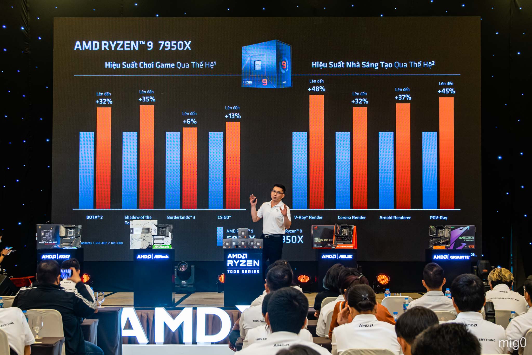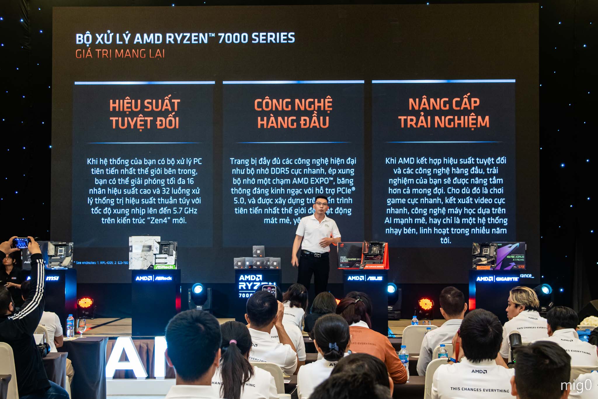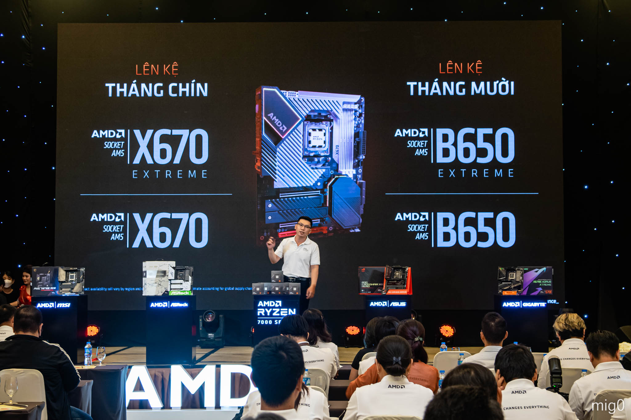 Dưới đây là 1 số hình ảnh ở sự kiện ra mắt AMD Ryzen™ 7000 Series CPU. Ngoài AMD thì còn có các gian hàng mini của những thương hiệu đối tác, như ASUS, GIGABYTE, MSI, ASRock ở mảng mainboard; Corsair, Kingston, G.Skill, Teamgroup ở mảng bộ nhớ; Cooler Master, Thermaltake, NZXT ở mảng phụ kiện…